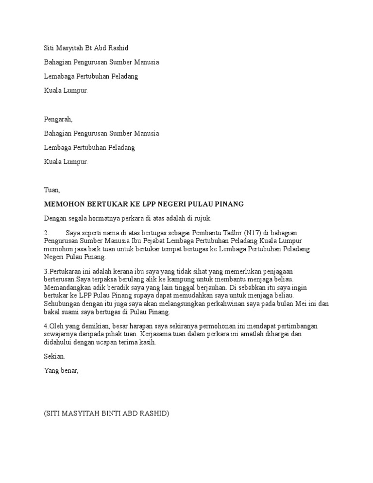 Contoh Surat Pertukaran Tempat Kerja Kerajaan Surat Rayuan Untuk Bekerja Semula Helowinj For More Information And Source See On This Link Lovingbillowyzy